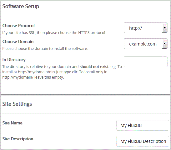 • In Directory: If you want to install this in a directory, for example example.com/forum, enter the directory name. Otherwise, leave this blank to install in your main domain example.com