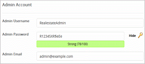 • Admin Username: Your new Open Real Estate username (for security reason do not use the "Administrator" or the "Admin" username.)