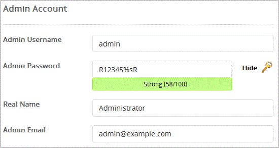 9. Under the "Admin Account" field enter the following information: