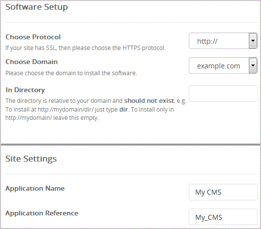• In Directory: If you want to install this in a directory, for example example.com/directory, enter the directory name. Otherwise, leave this blank to install in your main domain example.com