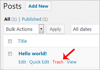 3. Hover your mouse on the "Hello World" post and the "Trash" option will appear. Click it to remove the post.
